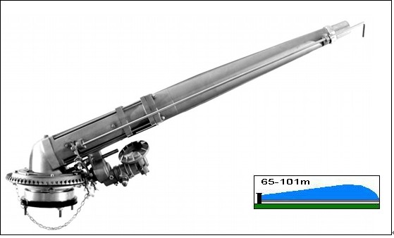 Specyficzne zraszacze turbinowe do montażu na deszczowniach (maszynach samobieżnych). Kąt wyrzutu strumienia deszczu: 25 ° trajektorii lotu. Możliwość szybkiego wyregulowania/ spozycjonowania. Doskonale sprawdzają się również na stromych zboczach. Całkowite wyeliminowanie wibracji, które mogą być powodowane ruchem wózka deszczowni. Są wyposażone w przerywanie przepływu strugi.